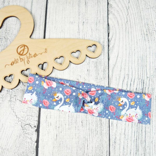 KU 54-57 Bandeau Knoten - Haarband Schwäne und Blumen Jeansoptik