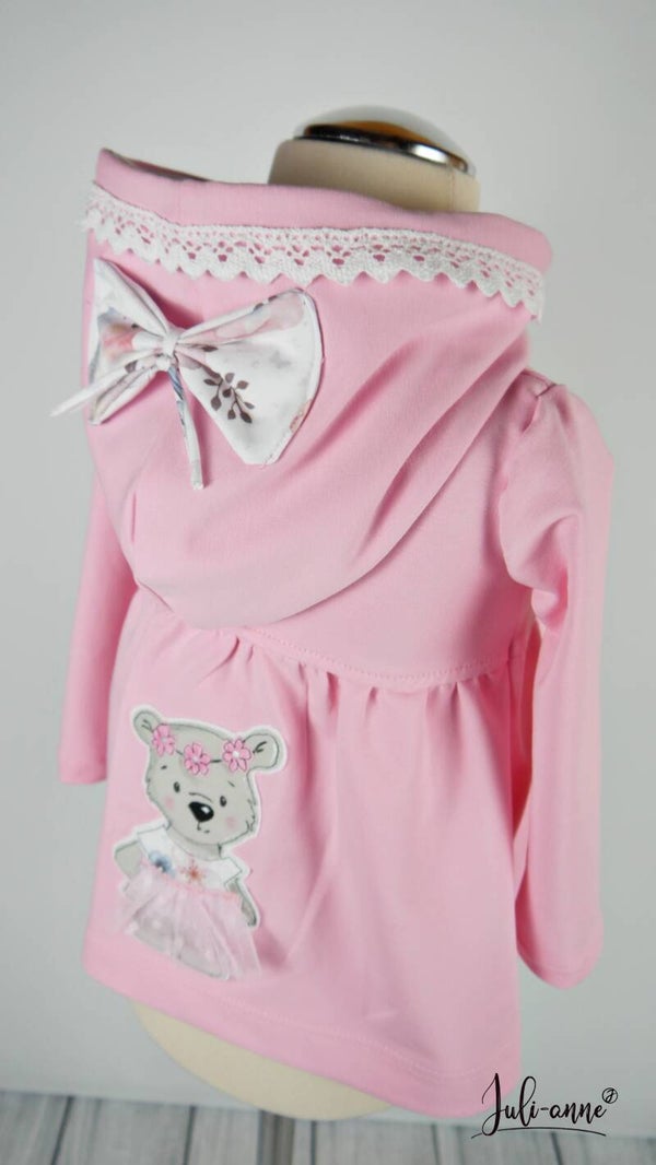 Hier bekommt ihr ein leichtes Jäckchen, dass aus Sommersweat genäht ist. Es ist für den Übergang und Sommer geeignet. Auf den Rücken befindet sich ein Applikation, die ich nach einer Vorlage von Stuffdeluxe selbst anfertige. Sie kann auf Wunsch auch weggelassen werden.