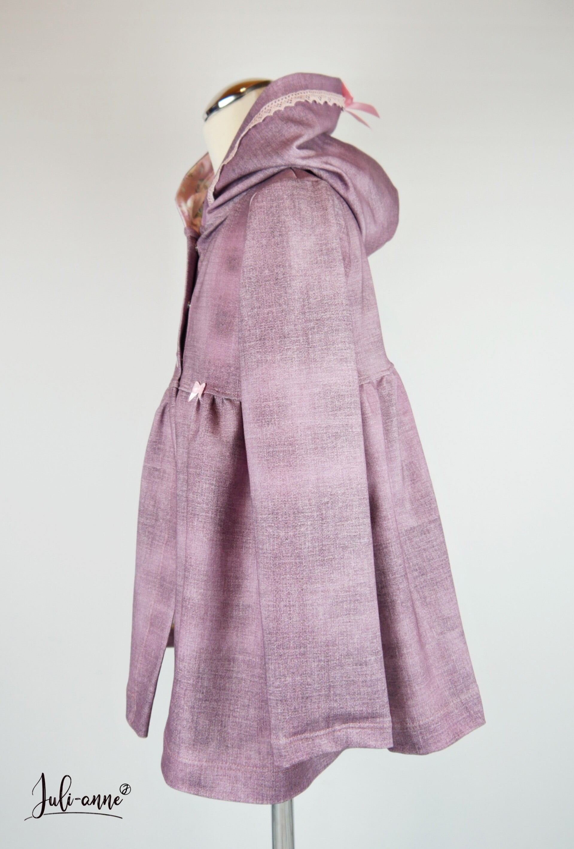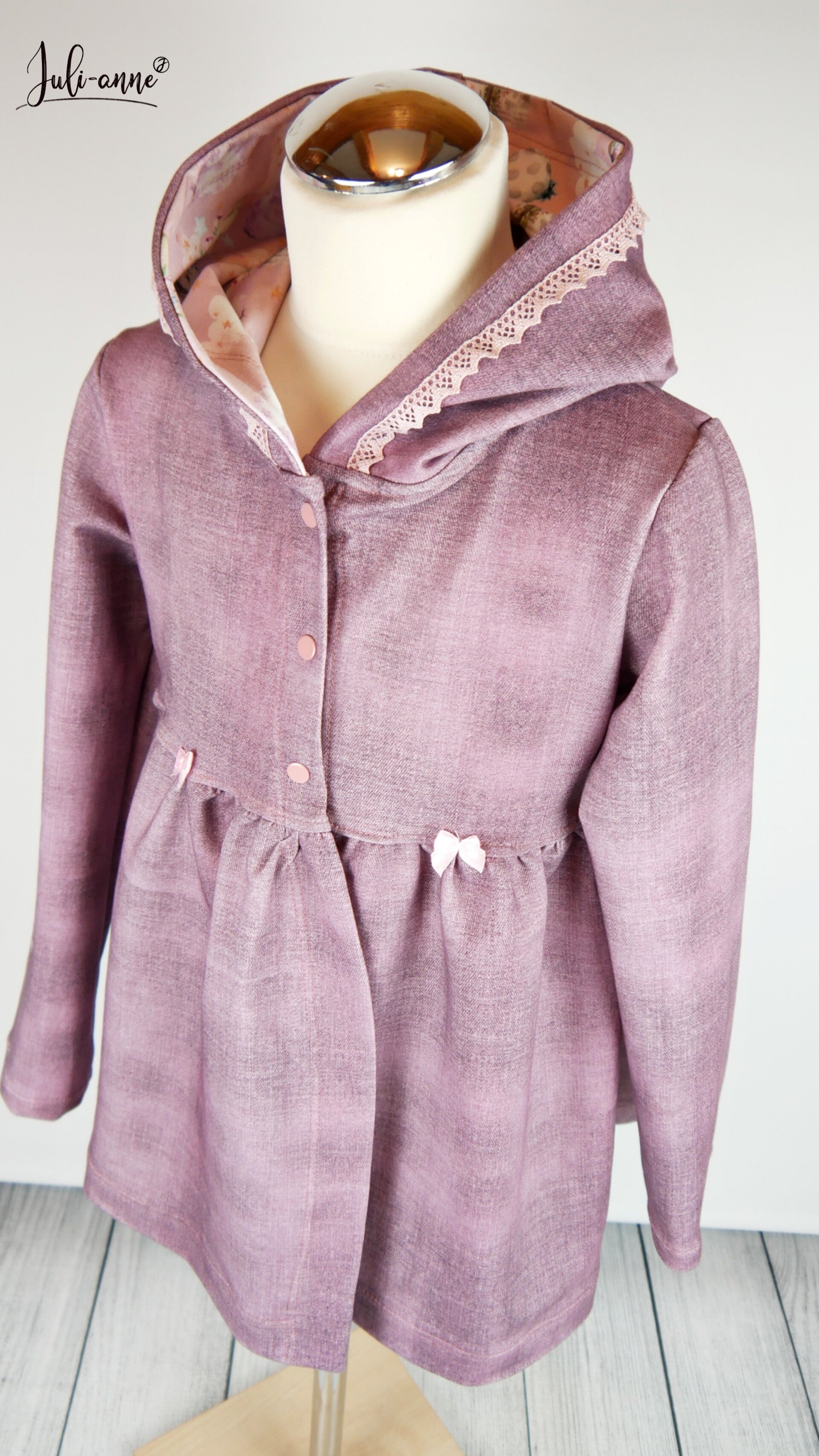 Nur die Kapuze ist gefüttert, die Jacke ist einlagig genäht. Sie wird mit Druckknöpfen verschlossen.