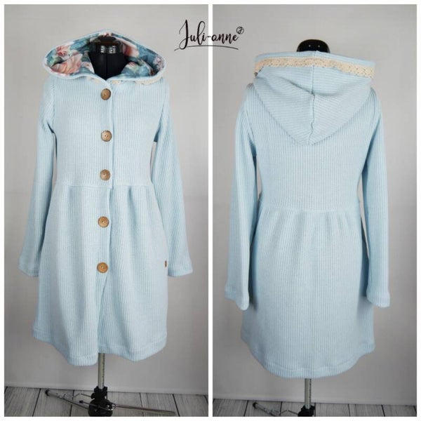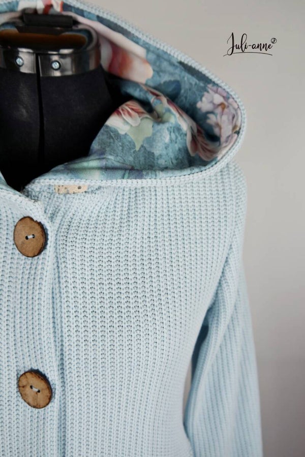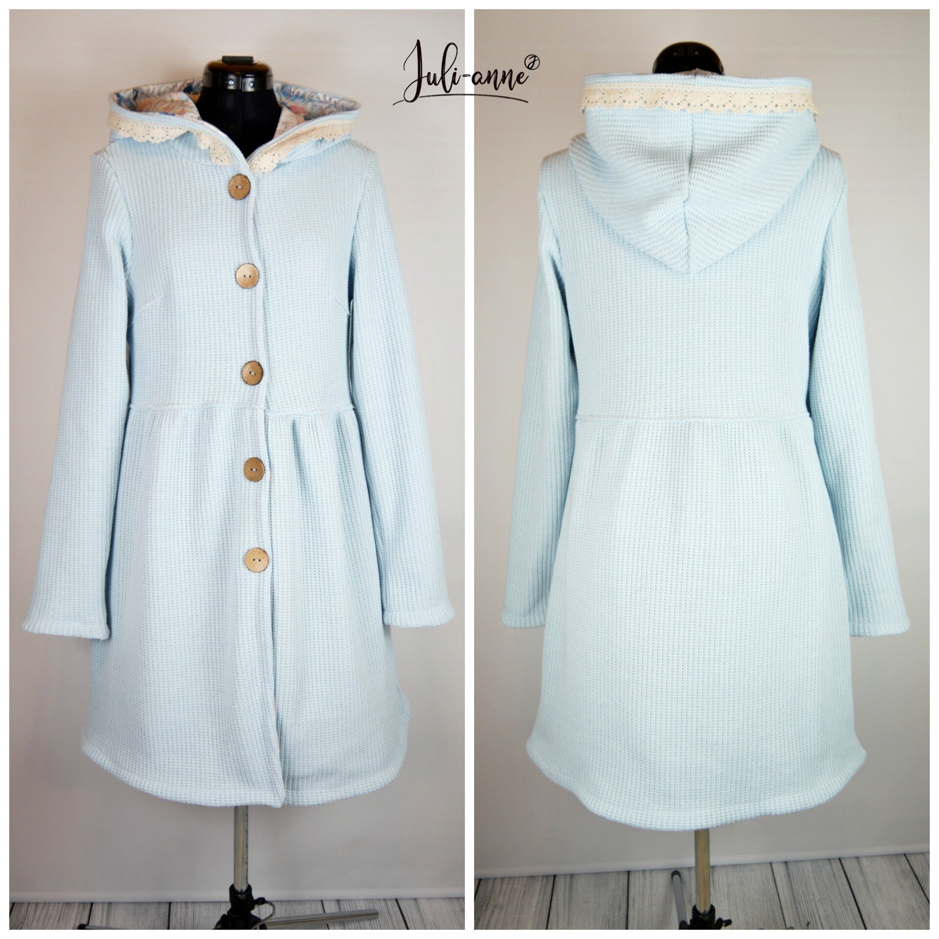 Der Mantel ist einlagig, nur die Kapuze ist mit Jersey gefüttert. Der Mantel eignet sich für die Übergangszeit und an kühlen Sommertagen.