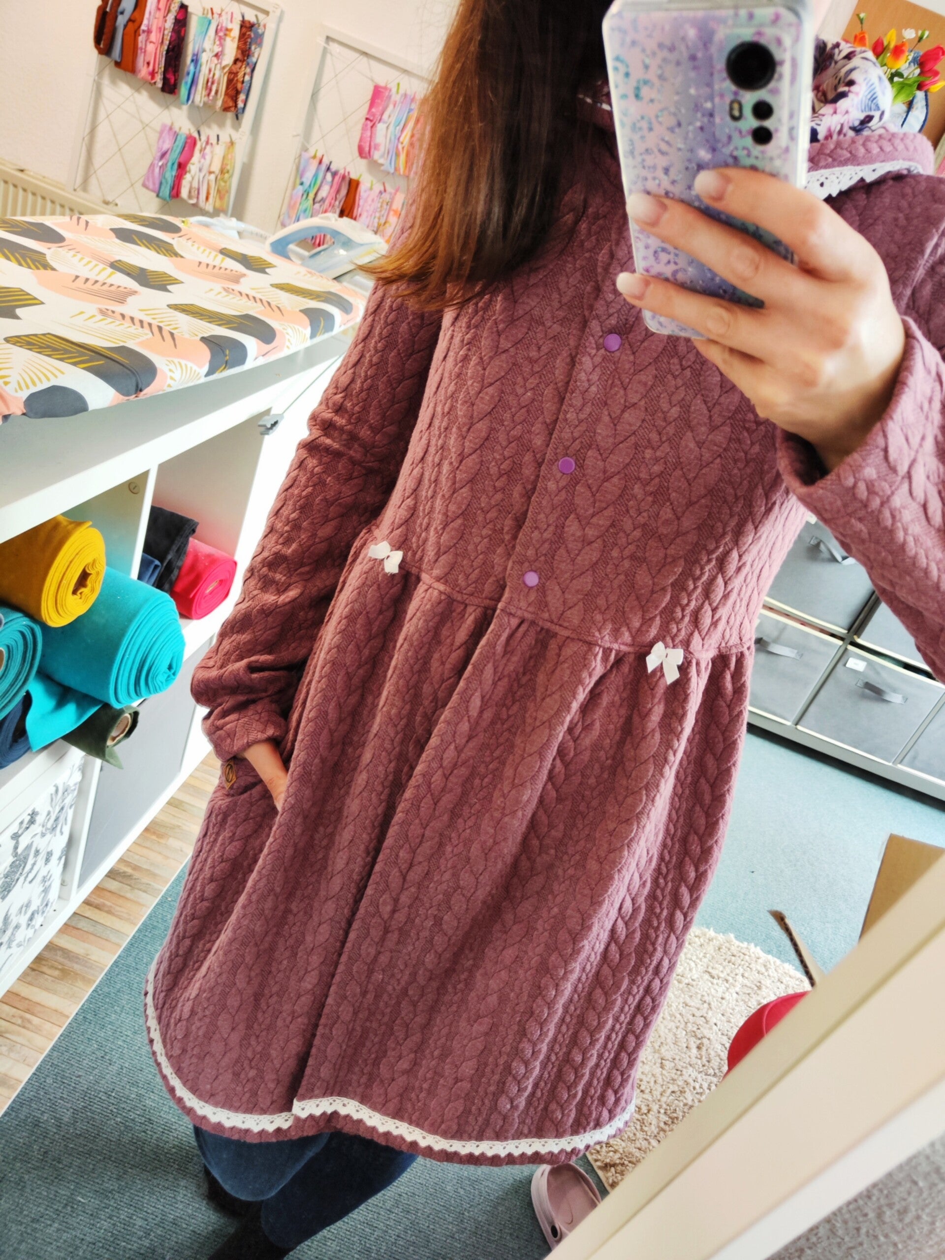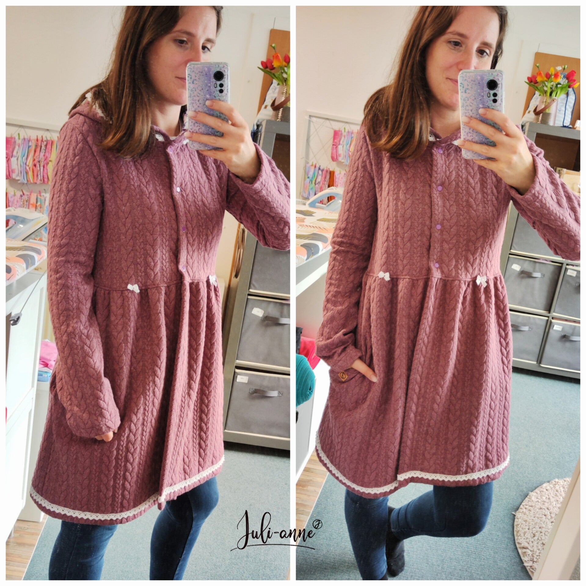 Er ist einlagig, nur die Kapuze. Damit ist der Mantel eine leichte Strickjacke zum Drüberziehen, wenn es etwas frischer wird.
