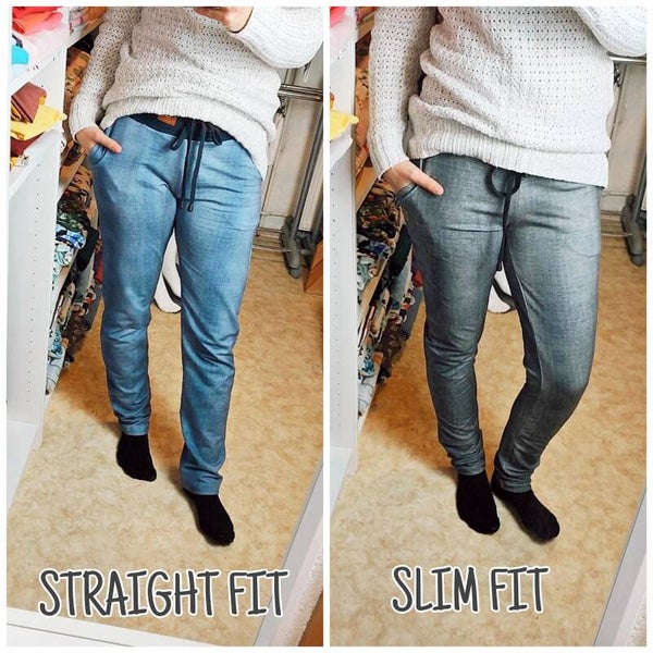 Du kannst sie in Slim Fit oder mit geraden Beinen bestellen. Auf den Bildern siehst du die Slim Fit.