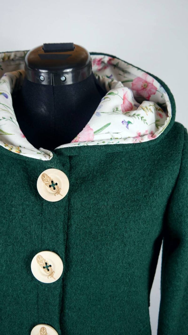 Der Mantel ist einlagig genäht, nur die Kapuze ist mit Jersey gefüttert. Das erleichtert die Pflege und erhält die natürlichen Eigenschaften von Wollwalk.