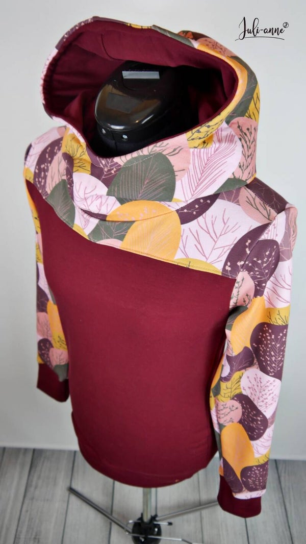Hier Nähe ich euch einen tollen Hoodie aus einem Sommersweat mit grafischen Bäumen und einem butterweichen Bio Softsweat in Uni Bordeaux.