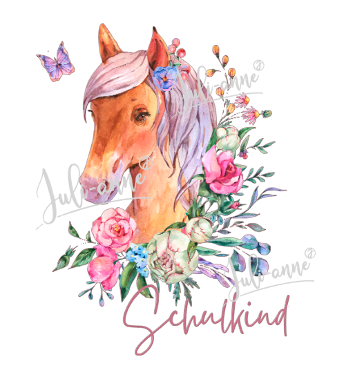 Bügelbild SCHULKIND Pferd mit Blumen