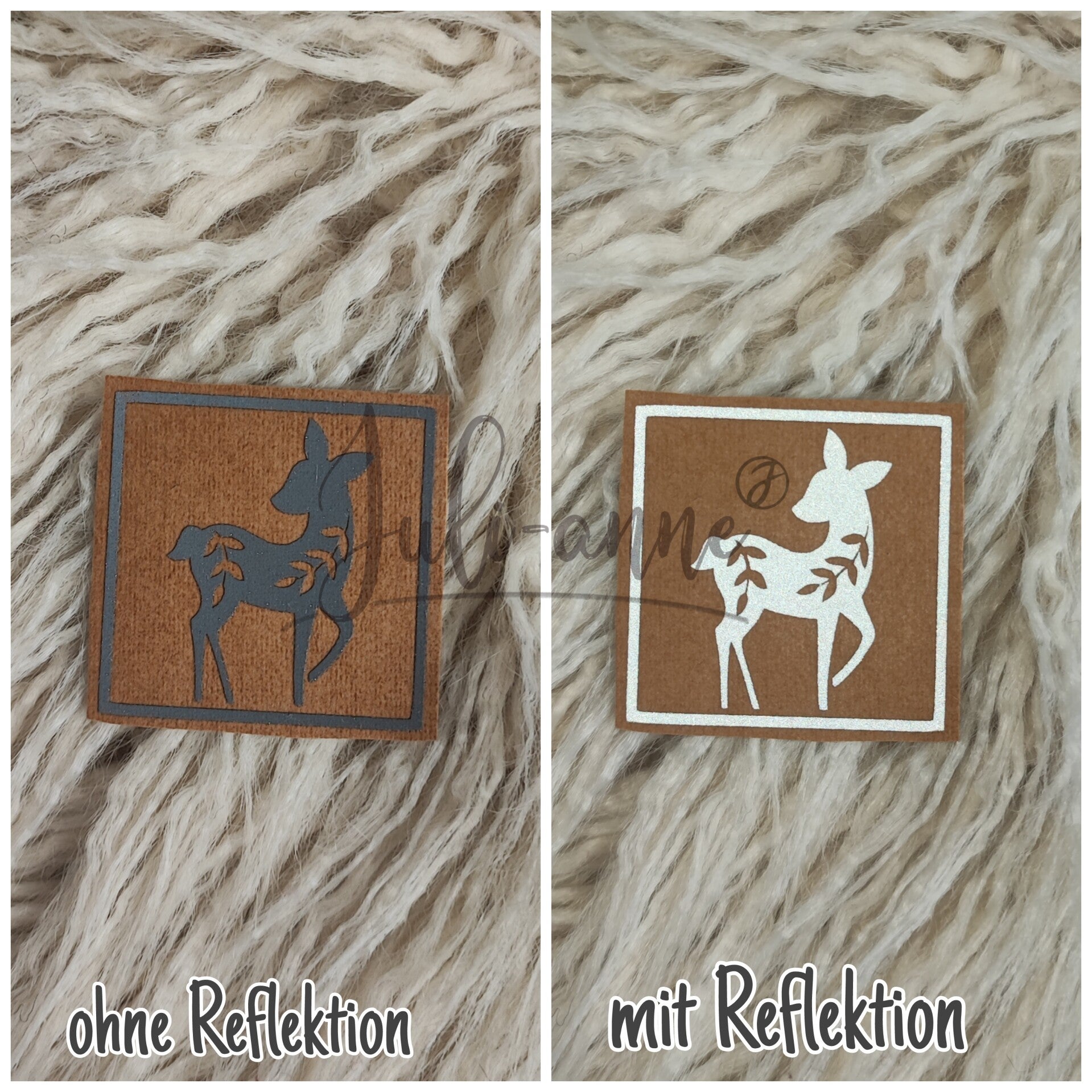 + 2 Snappap-Label mit reflektierender Folie zum Aufnähen.