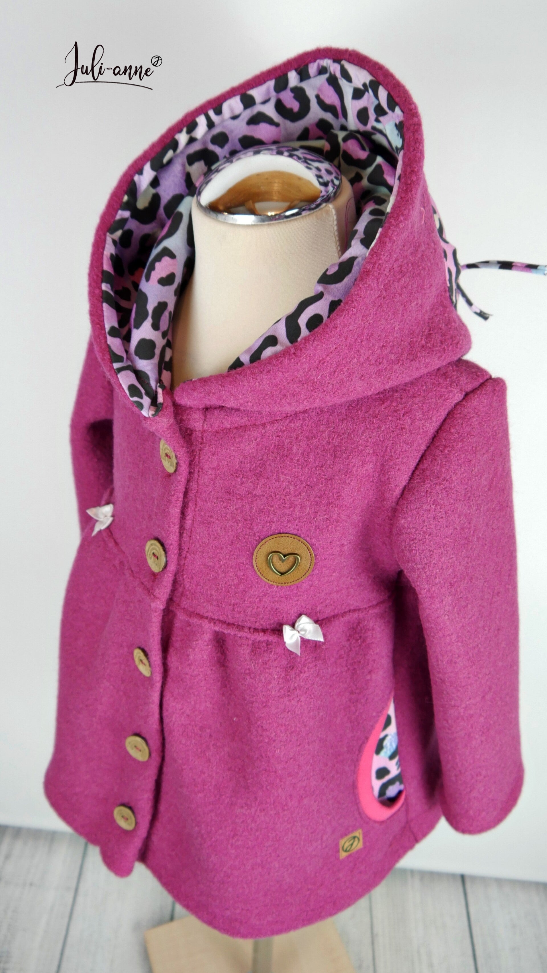Jumi ist ein süßes Jäckchen, dass ich hier aus Walk fertige. Die Jacke ist einlagig, nur die Kapuze ist gefüttert. Das ist besonders bei der Reinigung praktisch. Ein komplettes Futter aus Jersey ist nicht extra wärmend und außschließlich dekorativ, benötigt jedoch eher mal eine Reinigung.